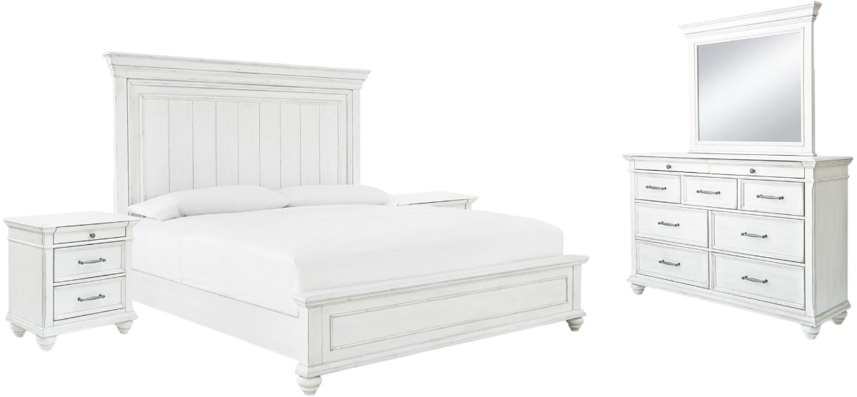 Includes king panel bed (headboard, footboard and rails), dresser with mirror and two nightstands