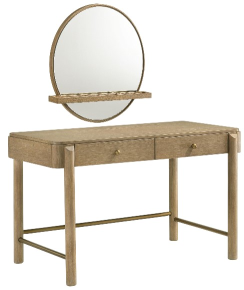 Transform your daily routine with the elegant 2-piece Arini makeup vanity set, a blend of modern coastal charm and subtle glamour. The vanity table, finished in a rich sand wash finish that highlights the wood grain, offers two spacious drawers for all your beauty essentials, accented by gold-finished ball knobs.Read More