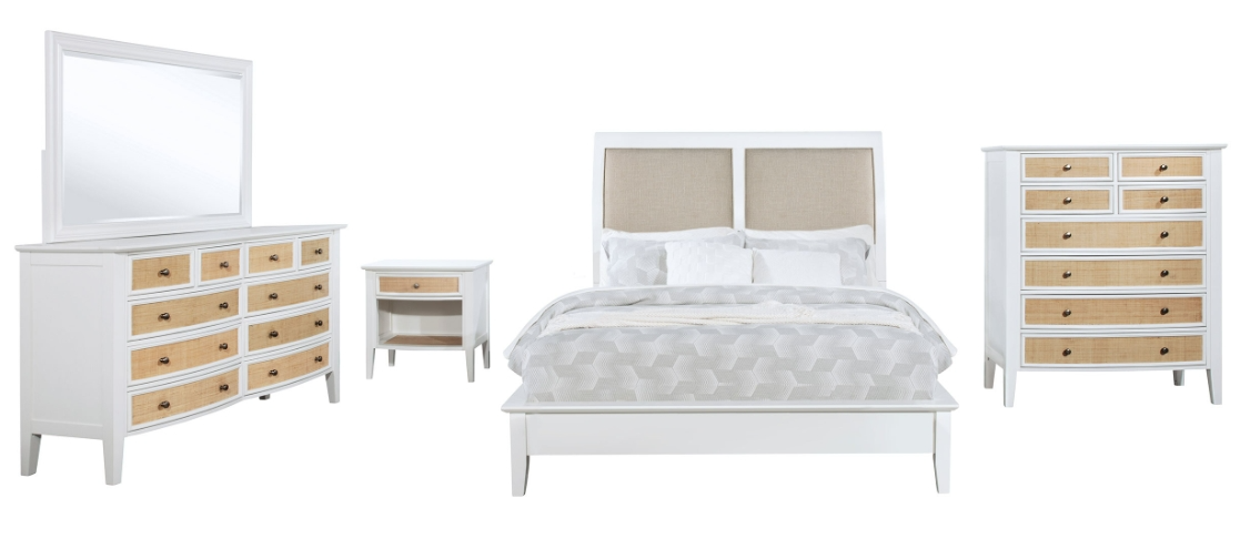 Textured rattan drawer fronts create a fresh, modern coastal aesthetic for this contemporary bedroom set. Offering ample storage and a clean look and feel, the set centers on a wooden bed with a gently flared, upholstered headboard with plush foam padding for easy comfort.Read More