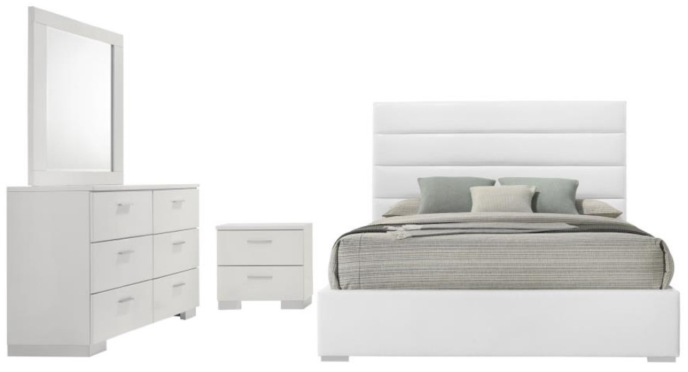 Modern bedroom set with a white faux leather platform bed and sleek case pieces