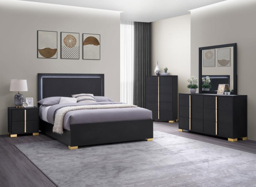 5-piece full bedroom set includes bed with LED headboard, nightstand, dresser, mirror, and chest