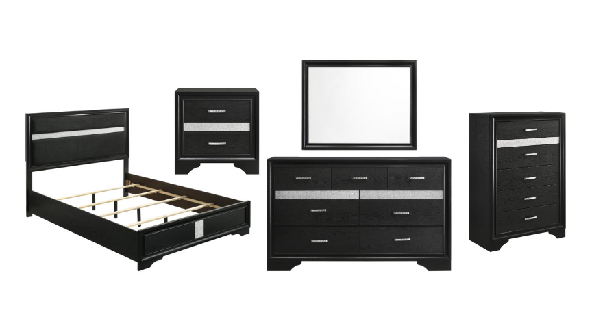Includes: One (1) eastern king bed, one (1) nightstand, one (1) dresser, one (1) dresser mirror, and one (1) chest
