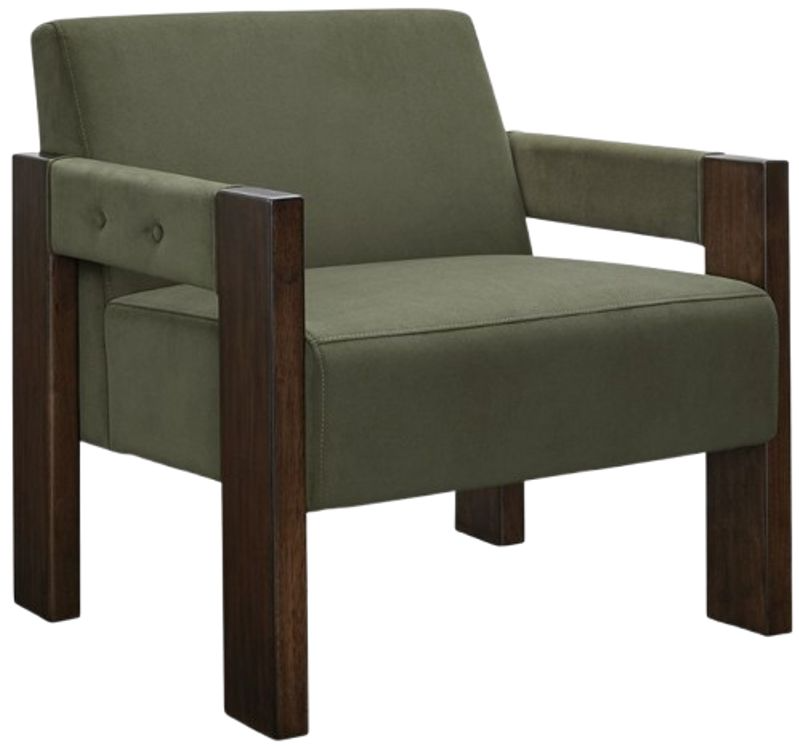 Get your modern sophistication on with this chic accent chair. Its rich olive green velvet upholstery is both luxurious and inviting, while an espresso-finished wood frame provides a warm, grounding element. The chair's clean lines and minimalist design make it a versatile piece that complements a variety of decor styles.Read More