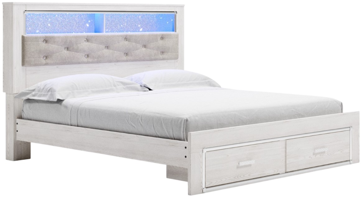 The epitome of fashion-forward design, this king upholstered bookcase bed is a beautiful blend of comfort and luxury. Shiny chrome-tone accents, a pearlized finish and button-tufted upholstery bring a glam touch to the richly rustic appearance. Remote-controlled LED lighting adds style and modern convenience to your restful retreat.Read More