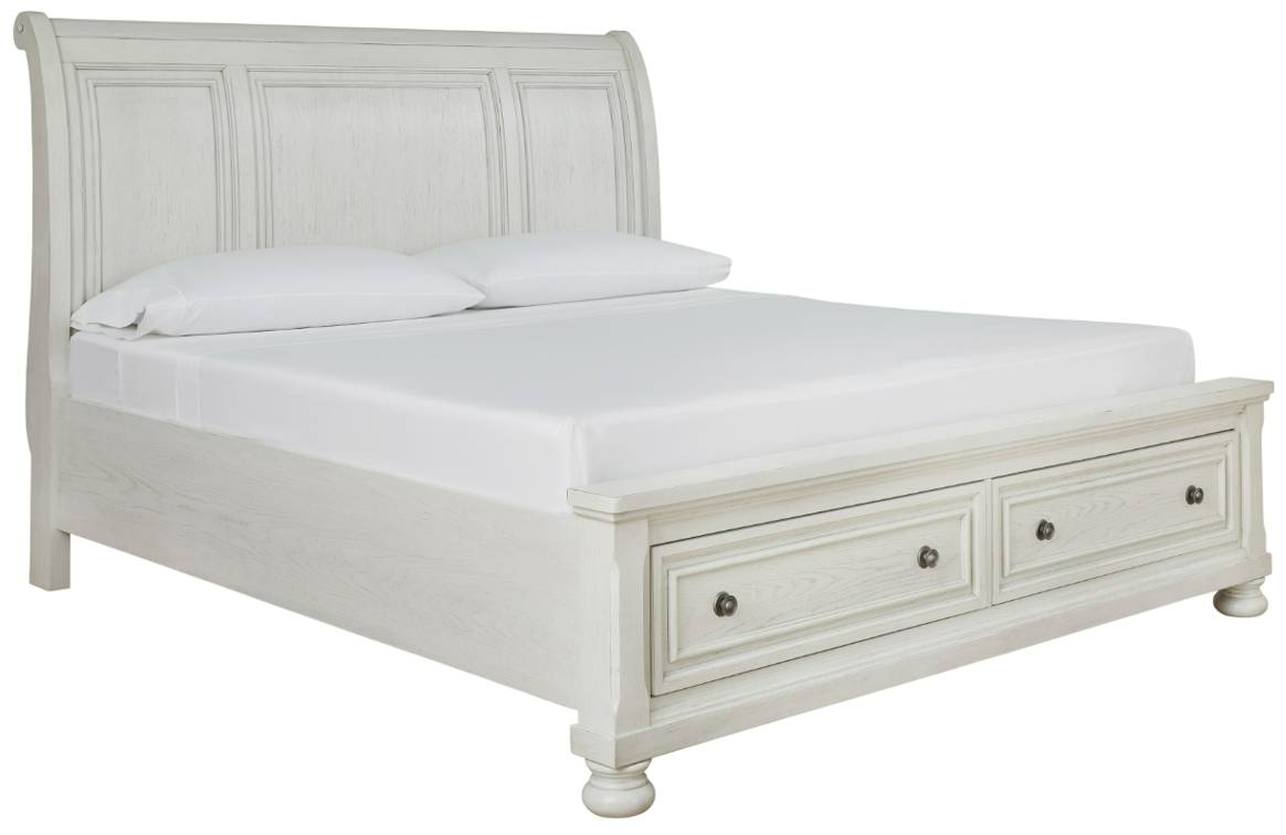 Elegant, timeless furnishings take your bedroom to the next level. Nothing does that better than this queen sleigh bed with storage footboard. The antiqued white finish with a wonderful grain texture oozes sophistication, while the dark bronze-tone hardware adds a sophisticated touch.Read More