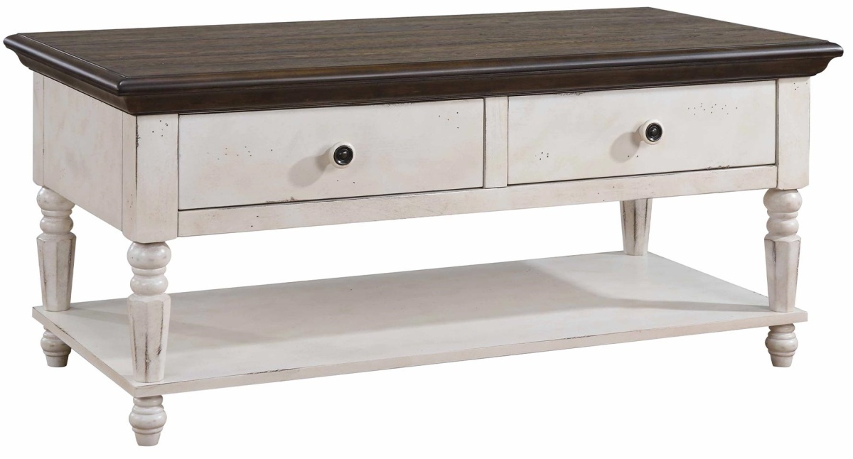 The TEI Vintage Estates Coffee Table is made from solid wood and veneer, featuring a sturdy build with a dark knotty oak top and an antique white base. It measures 44 inches wide, 22 inches deep, and 20 inches high. The distressed finish gives it a timeless, rustic charm.Read More